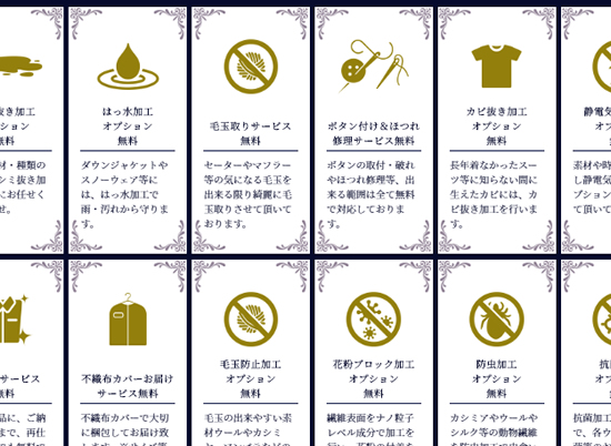 | オプション | ・ダブルクリーニング加工 ・はっ水加工 ・カビ抜き加工 ・静電気防止加工 ・ふんわり柔らか加工 ・毛玉防止加工 ・花粉ブロック加工 ・防虫加工 ・抗菌加工 ・防カビ加工 ・毛玉取りサービス ・ボタン付け&ほつれ修理サービス ・再仕上サービス ※すべて無料 |
